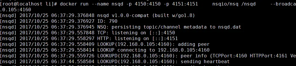 docker run --name nsqd -p 4150:4150 -p 4151:4151 nsqio/nsq /nsqd --broadcast-address=192.168.0.105 --lookupd-tcp-address=192.168.0.105:4160