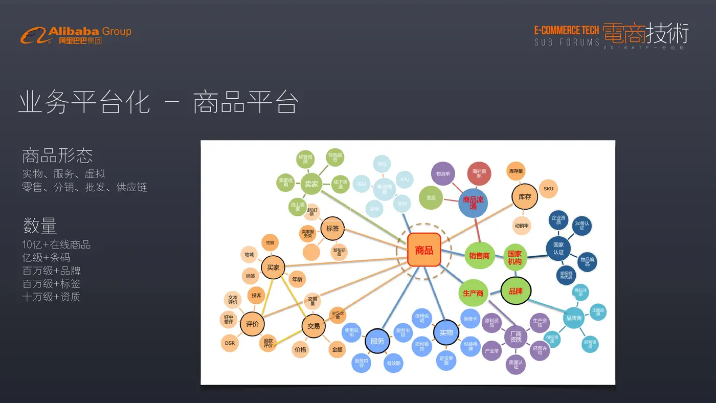 比如说我们看到这个商品的平台化,整个电商体系有10几亿的商品,涉及商品本身的物理属性、不同渠道的销售价格、库存等等。还有很多的不同类目的管控规则,比例医疗器械,必须要有企业资质证明,要有检验证明等等。而且还有些类目,因为市场定位不一样,管控的力度也不一样,比例淘宝和天猫在手机的管控上也都有差异。我们怎么去解决差异性的问题,这些东西就是在整个商品平台里面去做的。我们要通过建立元数据中心、规则中心、商品发布界面自动生成、图片扫描等等来实现商品管理的平台化。