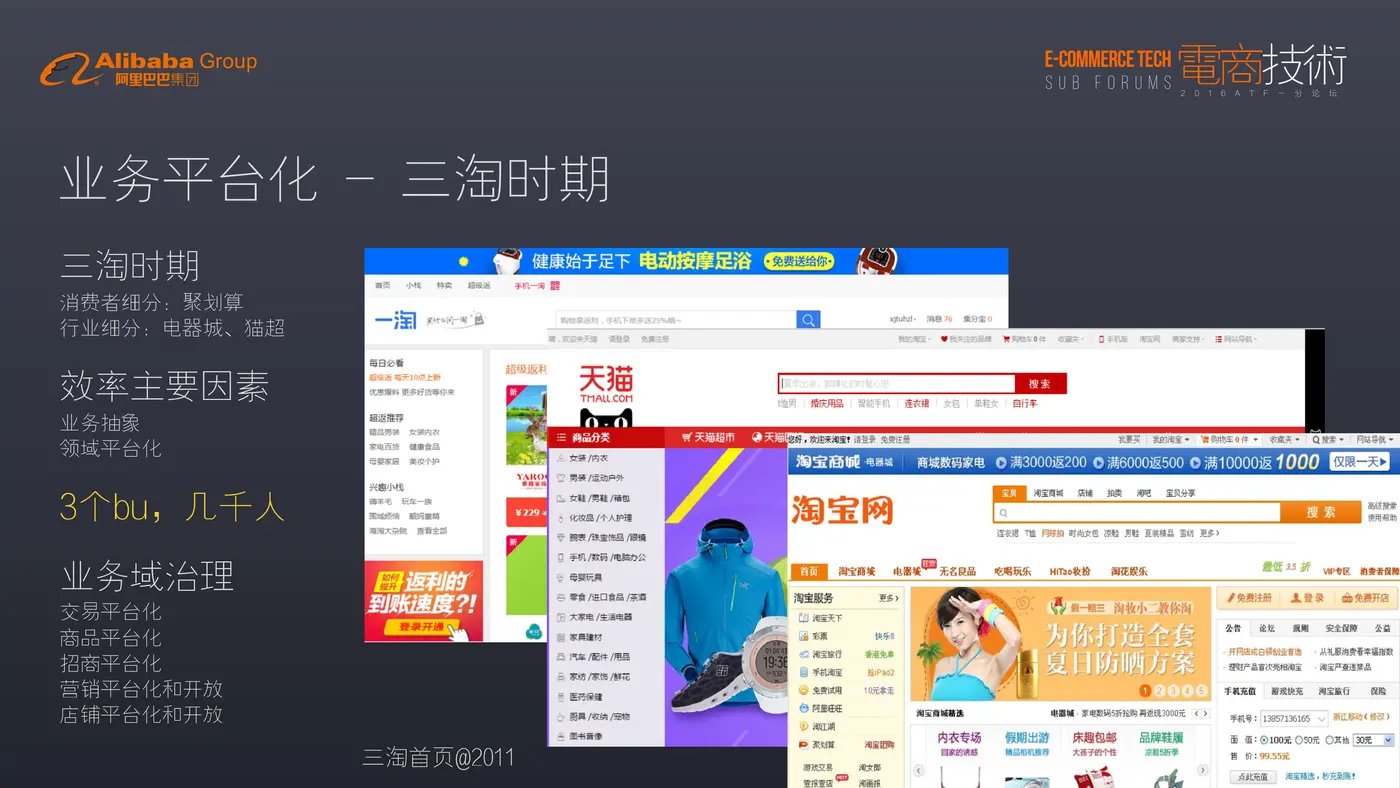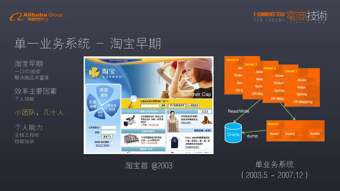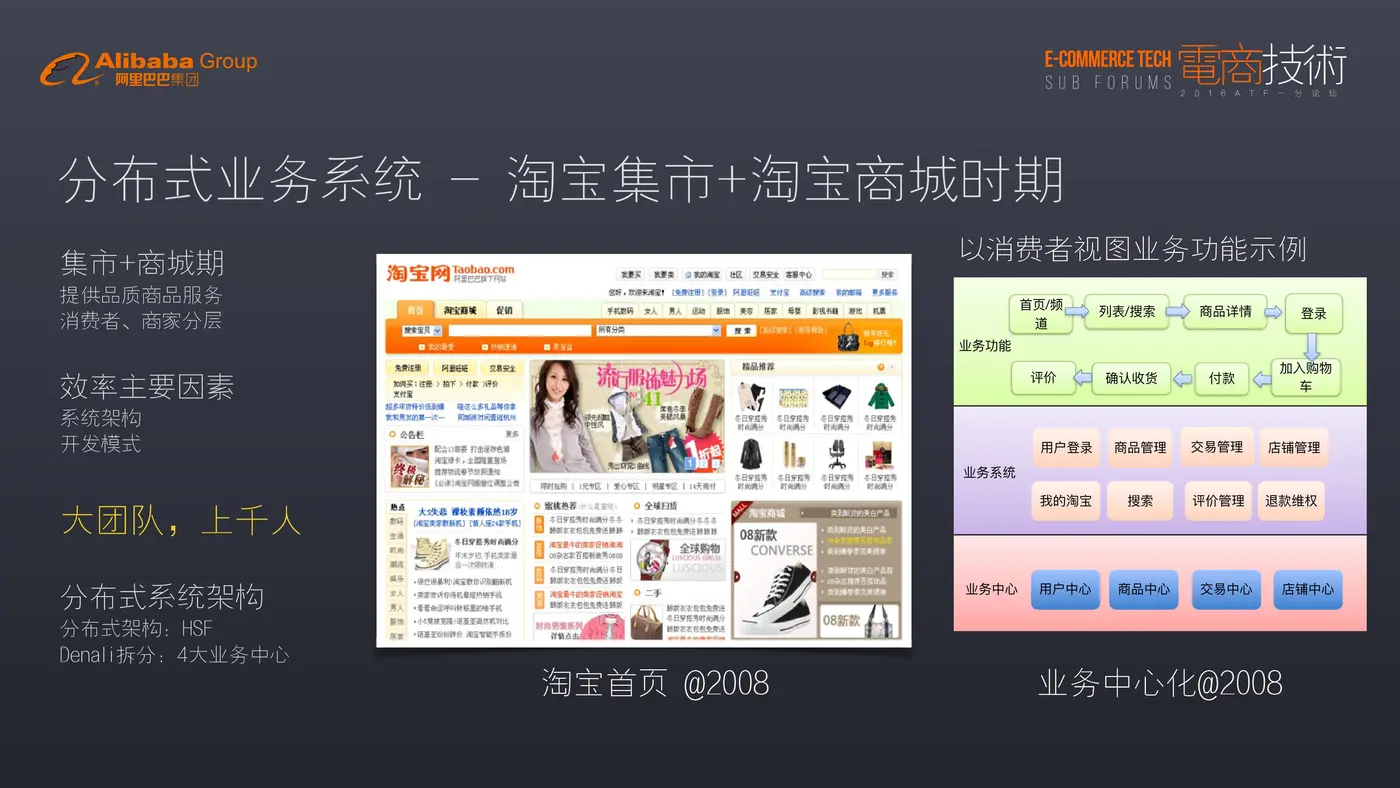 第一个阶段是淘宝早期的建立,业务简单,一个业务系统、几台机器就支撑了。刚开始系统不稳定,每天晚上都需要把系统重新启动一下。这是2003年的界面,我们还是保留了历史的痕迹。 这个阶段也分两个部分,最早是花50万买的别人的一个PHP的系统。随着业务的发展,逐步改造成了Java技术体系。系统名字叫Denali。随着电商的迅猛发展,业务品类的快速增长以及淘宝商城起来之后,技术人员的增加,这个系统搞不定了,效率和稳定性都变差了。