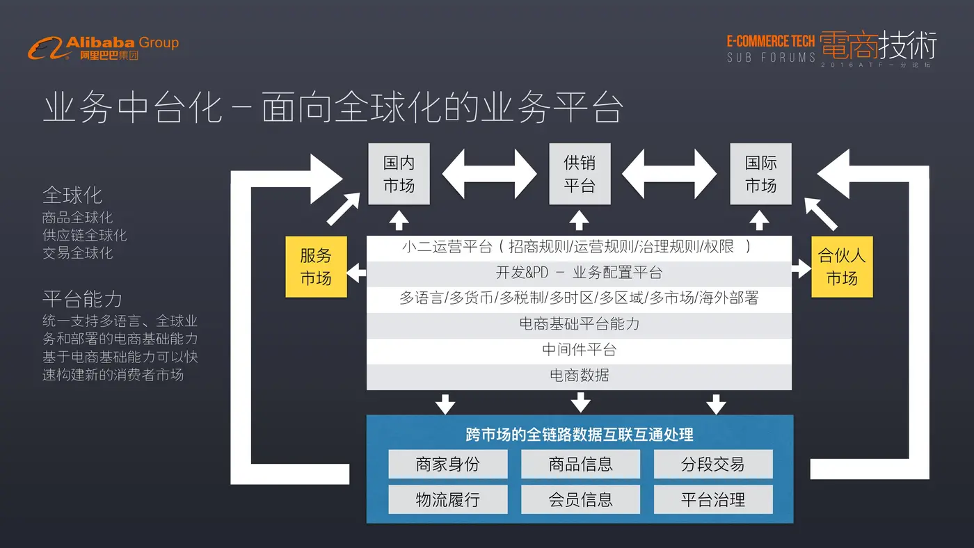 全球化是整个集团得战略方向。要能把我们中国的货卖到国外,国外货卖到中国,国外不同国家之间的货物买卖。这些东西都涉及我们整个电商基础设施的升级,包括多语言、多币种、多时区的支持。但他不仅仅这些,还有更复杂的电商基础模型的升级。比如中国有一个很好的制造商,商品品质好。但是他们自己本身不具备英语的能力,俄语的能力,这时候在我们的电商体系里面,如何帮助他把货物卖到全球去。国外的品牌如何简单方便的把货物在淘宝、天猫、聚划算、1688、农村淘宝上去卖等等。比如说华为生产的手机,在天猫上卖的价格、AliExpress上的价格不一样,而且整个的营销模式不一样。“双十一”搞活动的时候,你会发现因为时差的问题,我们整个交易营销的控制逻辑都极大的提升了复杂度。会员安全控制的复杂度等等,都会发生天大的变化。当我们面对全球化的时候,所有基础的模型都会发生变化,涉及到我们对电商商业领域的理解升级,基础模型升级,平台能力升级。