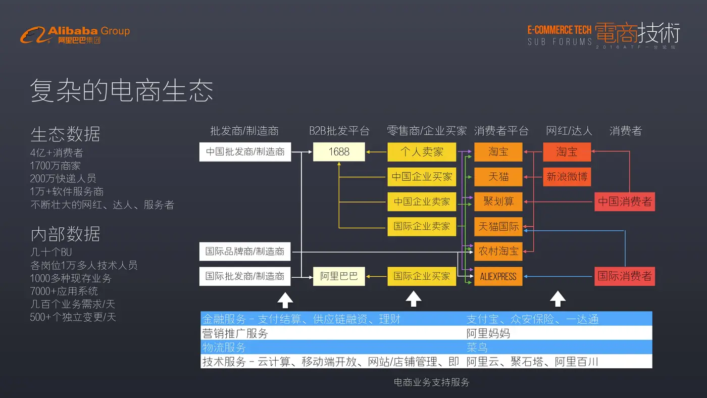 在复杂的电商生态中,我们有4亿多的消费者,这是我们最大的资产。我们要服务好这几亿消费者,只是阿里巴巴是不可能的,现在有1700多万商家,在全国有200多万快递人员。有上万家软件服务商为我们的商家提供企业支撑软件。随着电商生态的发展,有更多的生态角色不断出现,例如大家都知道的网红。这些是外部生态。内部也从淘宝,一步步的发展壮大,现在有几十个事业部,相关的技术人员有一万多人。支撑了7000多个应用,上千种现存的业务,每天几百个业务需求,500多个独立的变更。面对这样一个复杂的体系,我们如何应对它呢?这就是我重点要讲的业务平台的发展历史。