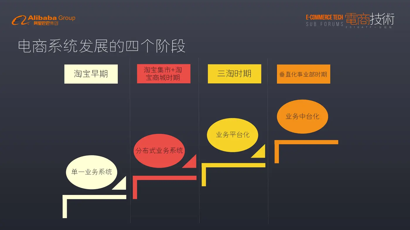 电商系统的发展经历了四个阶段。第一个就是淘宝生长期,单一业务系统阶段。第二个是淘宝集市+淘宝商城时期,分布式业务系统阶段。第三个是三淘(淘宝、天猫、一淘)时期、业务平台化阶段。第四个就是目前的垂直化事业部、业务中台化阶段。