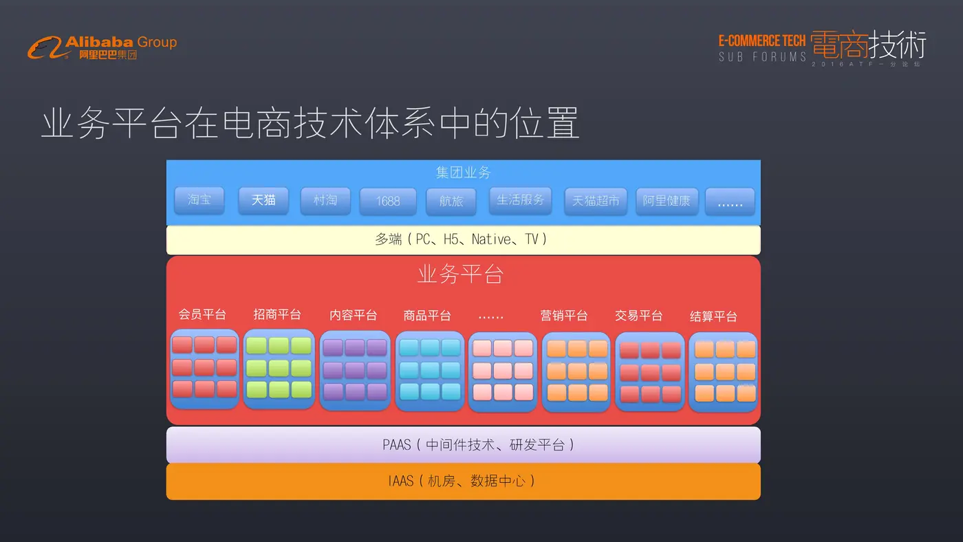 在电商技术体系里面,我们会看到中间有一层非常关键的业务平台。淘宝网、天猫、聚划算,以及1688等耳闻目详的零售市场,都是基于业务平台建立的。很多业务也是通过业务平台进行串联的。在业务平台中包括了会员、商品、交易、营销、资金结算、店铺、评价等等电商的基础平台。4亿多会员、10多亿的商品,双11一天900多亿的成交都是在业务平台中进行管理完成的。业务平台是整个电商业务生态的基础。这是非常复杂的业务抽象和业务逻辑控制层。这一层的能力,直接决定了业务发展的速度和业务创新的成本。