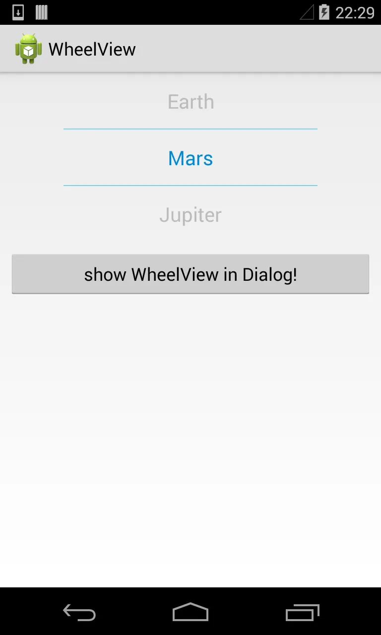 /** * Author: wangjie * Email: tiantian.china.2@gmail.com * Date: 7/1/14. */ @AILayout(R.layout.main) public class MainActivity extends AIActivity { public static final String TAG = MainActivity.class.getSimpleName(); private static final String[] PLANETS = new String[]{"Mercury", "Venus", "Earth", "Mars", "Jupiter", "Uranus", "Neptune", "Pluto"}; @AIView(R.id.main_wv) private WheelView wva; @Override public void onCreate(Bundle savedInstanceState) { super.onCreate(savedInstanceState); wva.setOffset(1); wva.setItems(Arrays.asList(PLANETS)); wva.setOnWheelViewListener(new WheelView.OnWheelViewListener() { @Override public void onSelected(int selectedIndex, String item) { Logger.d(TAG, "selectedIndex: " + selectedIndex + ", item: " + item); } }); } @AIClick({R.id.main_show_dialog_btn}) public void onClickCallbackSample(View view) { switch (view.getId()) { case R.id.main_show_dialog_btn: View outerView = LayoutInflater.from(context).inflate(R.layout.wheel_view, null); WheelView wv = (WheelView) outerView.findViewById(R.id.wheel_view_wv); wv.setOffset(2); wv.setItems(Arrays.asList(PLANETS)); wv.setSeletion(3); wv.setOnWheelViewListener(new WheelView.OnWheelViewListener() { @Override public void onSelected(int selectedIndex, String item) { Logger.d(TAG, "[Dialog]selectedIndex: " + selectedIndex + ", item: " + item); } }); new AlertDialog.Builder(context) .setTitle("WheelView in Dialog") .setView(outerView) .setPositiveButton("OK", null) .show(); break; } } }