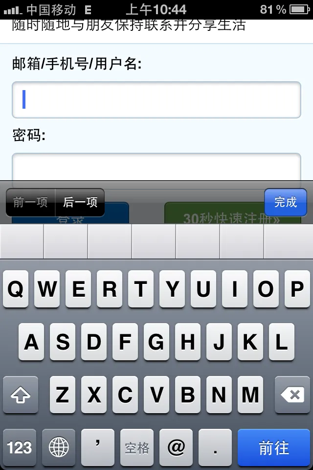 首先,关于输入法的问题,我觉得这不是个问题了,大概我们都清楚,目前的手机应用很多已经解决了这个问题,这里举个例子,我用手机登录人人网时,当输入账户时,其输入法界面自动调整成以下的形式,这里有“@”,“.”,这是为了方便用户输入的方便,因为大部分人还是用邮箱注册的账户。