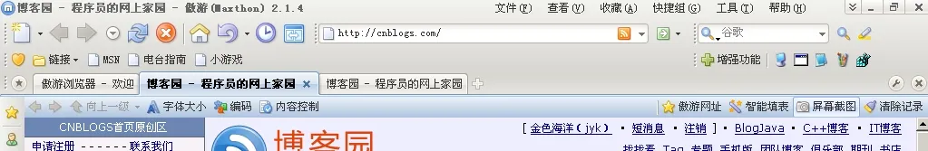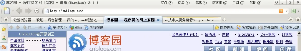 看了园子里面几篇关于chrome的文章,也下载了一个玩玩,安装之后感觉很意外,因为今天早上刚刚安装了遨游2(以前一直在用遨游1来着),感觉她们两个长得有点像,先发几个截图。