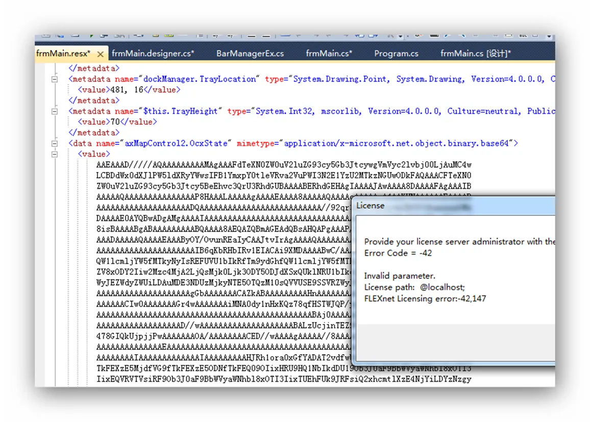 在修改已有框架的权限时,虽然有源代码,但更改LicenseControl或使用AoInitialize无效,打开程序被强制关闭,并报错-42,原来是OcxState作怪,必须全部手动删除,要么只有删除控件,全部重新拖放并布局。