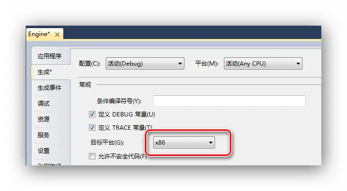 打开项目的属性-生成-常规-目标平台,选择X86.