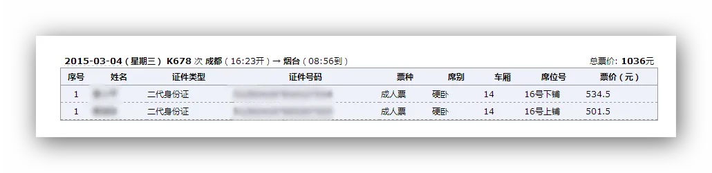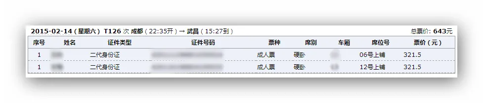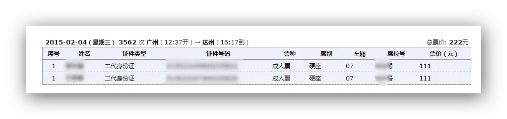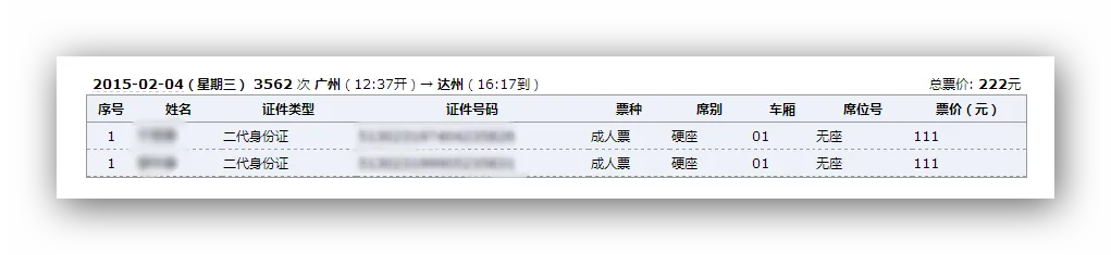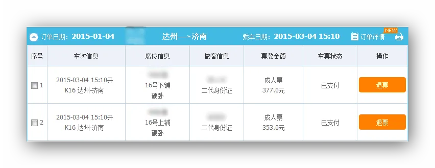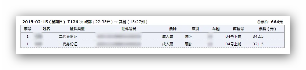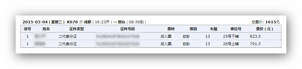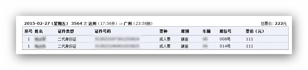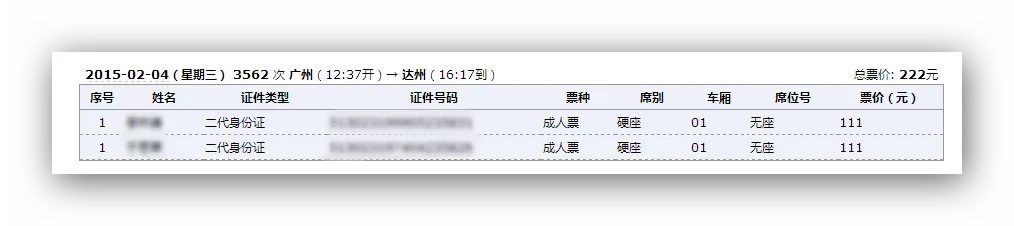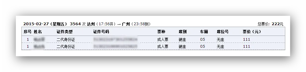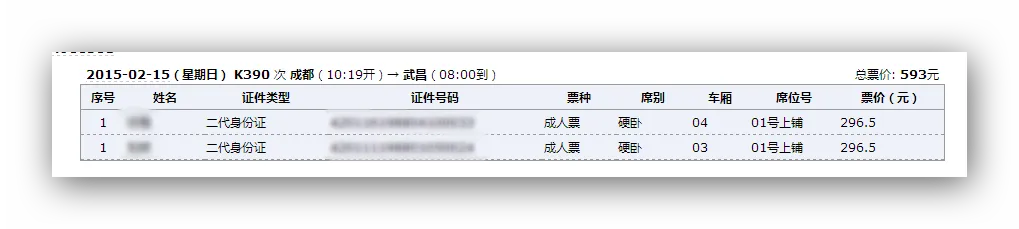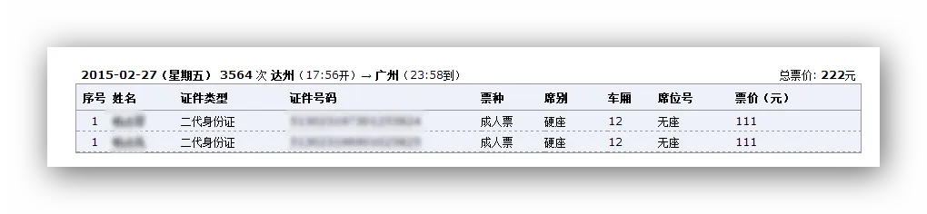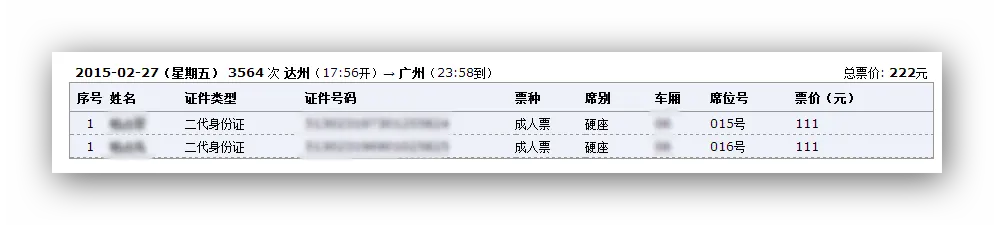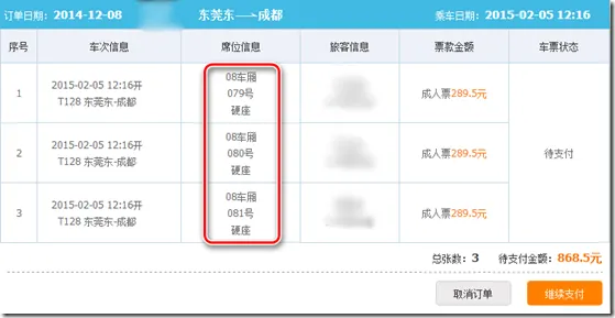 今天,我采用了两种方式,两个账号来抢票,出乎意料的是,居然抢得同人同时间同车次不同座位的车票。