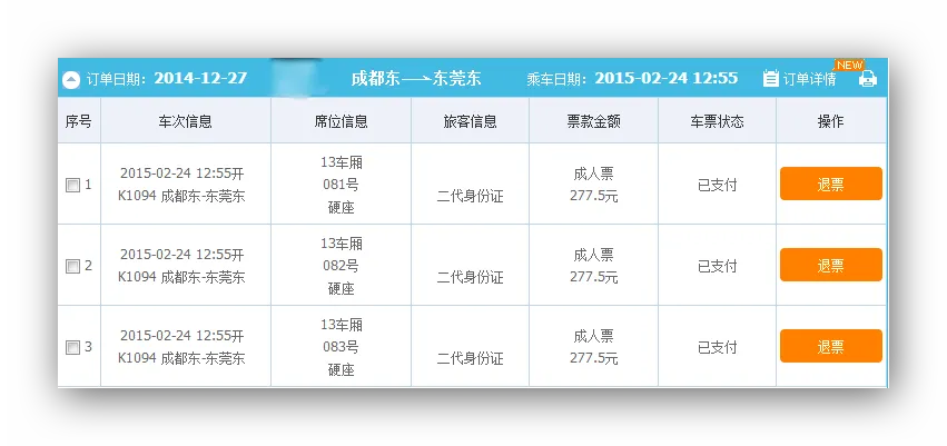先是两次刷到无座,然后退了,最后还是刷到硬座(而且是同人同时同车次同席别!下面四个订单为同一乘车人)
