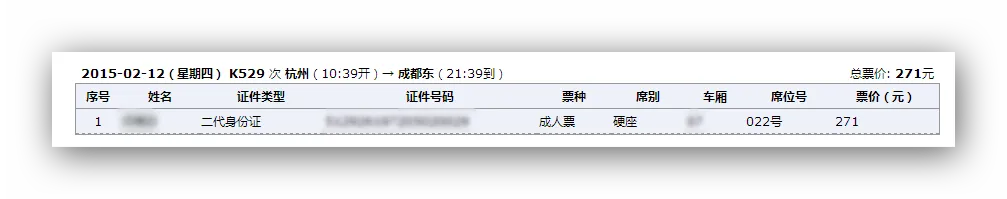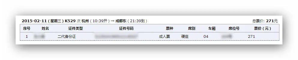 刷得K529杭州到成都东硬座一张。