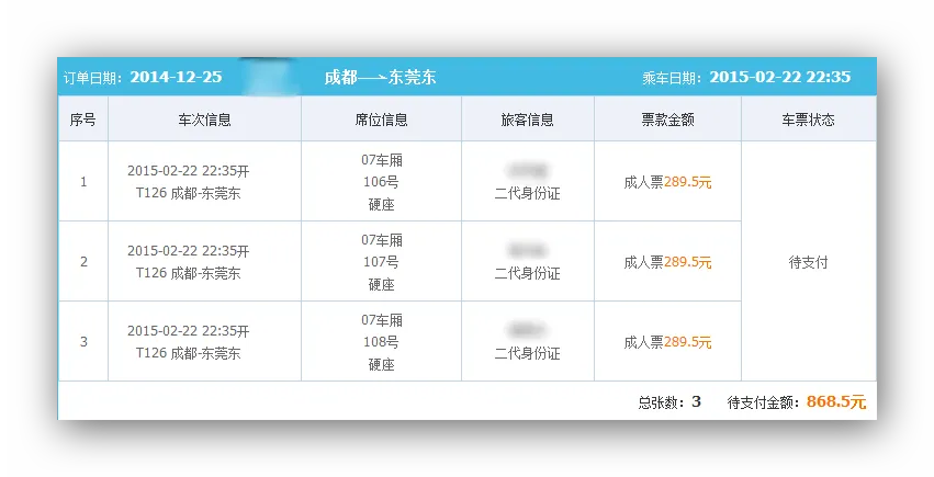 今天试抢初四成都到东莞东的T126,我采用了两种方式(木鱼的12306助手和心蓝),两个账号来抢票,出乎意料的是,居然抢得同人同时间同车次不同座位的车票。明天加油!