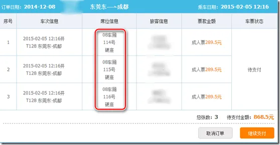 但现在它推出自己登记的方式,登记网址:http://www.kupaijie.com/ticket.php 查询网址:http://www.kupaijie.com/list.php 这种抢票方法是要自己提供账号,抢到后自己付款。今天群里的高手们帮我抢了东莞东到成都(T128)硬座三张。