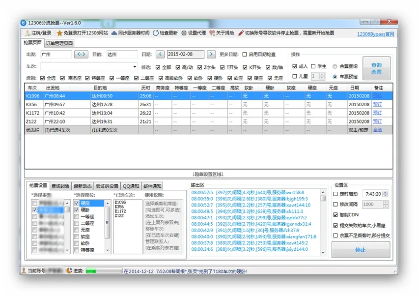 今日战果:早上一票无成;中午广州-达州,硬座两张(360浏览器抢票王)。