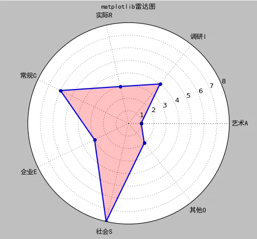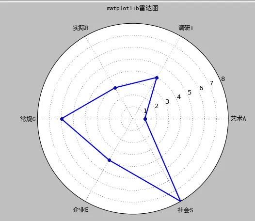 ''' matplotlib雷达图 ''' import numpy as np import matplotlib.pyplot as plt #=======自己设置开始============ #标签 labels = np.array(['艺术A','调研I','实际R','常规C','企业E','社会S']) #数据个数 dataLenth = 6 #数据 data = np.array([1,4,3,6,4,8]) #========自己设置结束============ angles = np.linspace(0, 2*np.pi, dataLenth, endpoint=False) data = np.concatenate((data, [data[0]])) # 闭合 angles = np.concatenate((angles, [angles[0]])) # 闭合 fig = plt.figure() ax = fig.add_subplot(111, polar=True)# polar参数!! ax.plot(angles, data, 'bo-', linewidth=2)# 画线