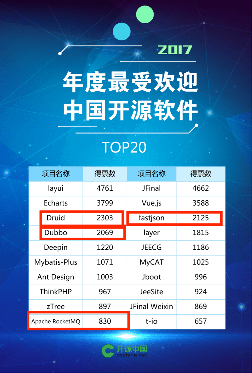 近日,开源中国公布了2017年度“最受欢迎中国开源软件”榜单,阿里中间件(Aliware)4大开源项目,数据库连接池Druid、JSON解析库Fastjson、分布式服务框架Dubbo、消息中间件Apache RocketMQ再次上榜。据榜单显示,上榜前4位是前端UI框架相关,其后的5、6、7位均为阿里中间件开源产品,在后端开源上,阿里中间件遥遥领先。了解开源软件的用户对这一幕一定不陌生,因为这4大项目已经连续霸榜多年。
