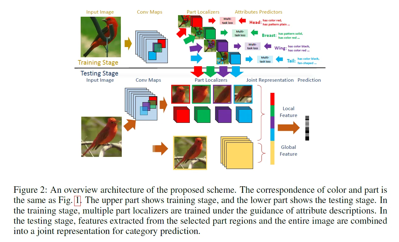 本文主要是将part描述利用起来,协助进行part定位,针对每一个定位好的part,再进行每一个part对应属性的识别。首先来看一张图,有一个直观的印象: