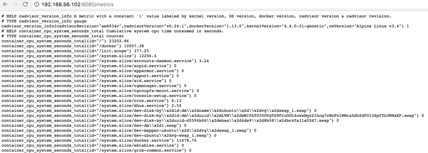 cAdvisor 启动后,将通过 8080 提供 host 的监控数据。在浏览器中通过 http://192.168.56.102:8080/metrics 测试一下。