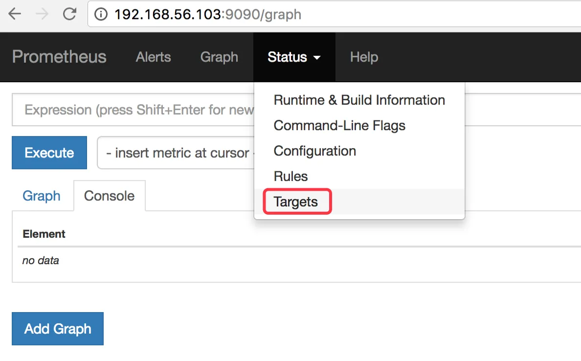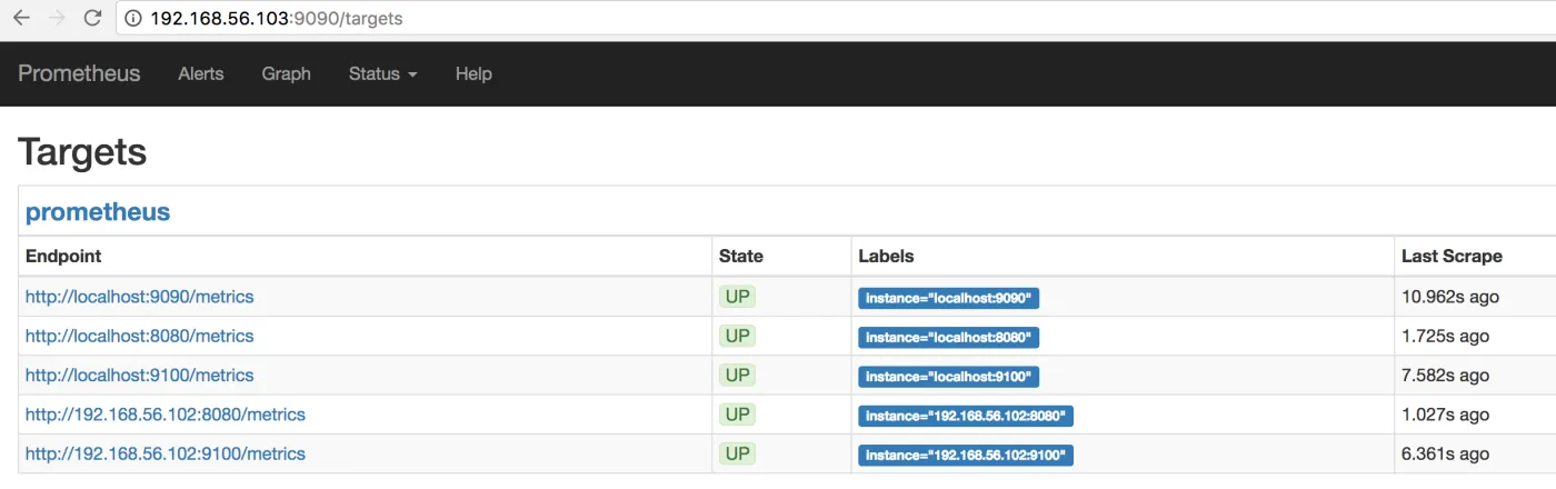 在浏览器中打开 http://192.168.56.103:9090 ,点击菜单 Status -> Targets