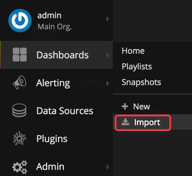 ,得到一个 json 文件,然后点击 Grafana 左上角菜单 Dashboards -> Import