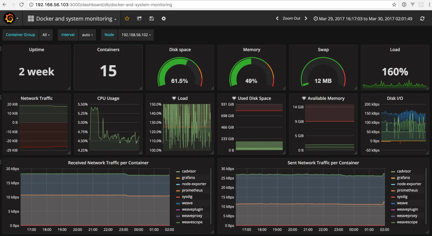 我们将通过 Prometheus 监控两台 Docker Host:192.168.56.102 和 192.168.56.103,监控 host 和容器两个层次的数据。