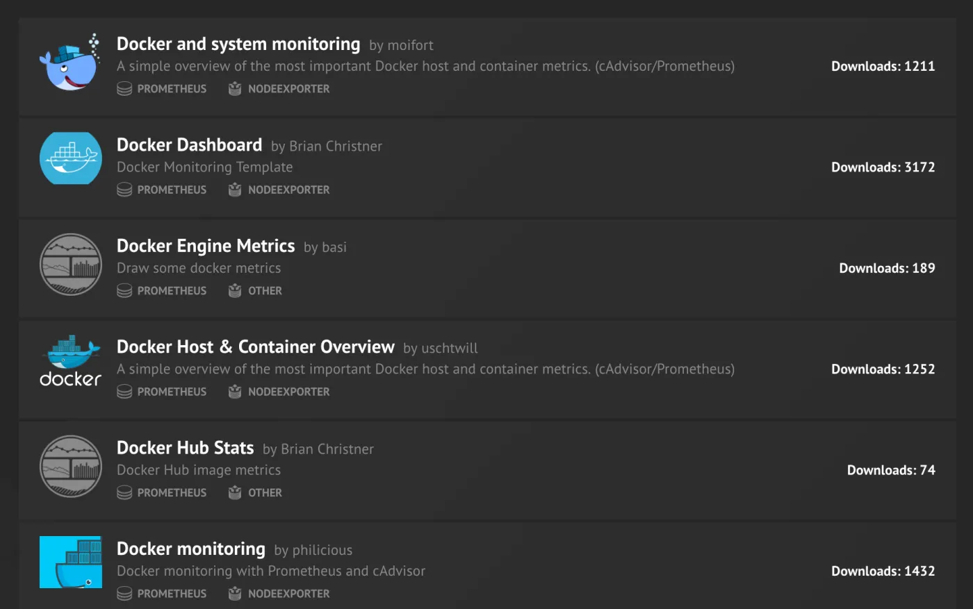 访问 https://grafana.com/dashboards?dataSource=prometheus&search=docker,将会看到很多用于监控 Docker 的 Dashboard。