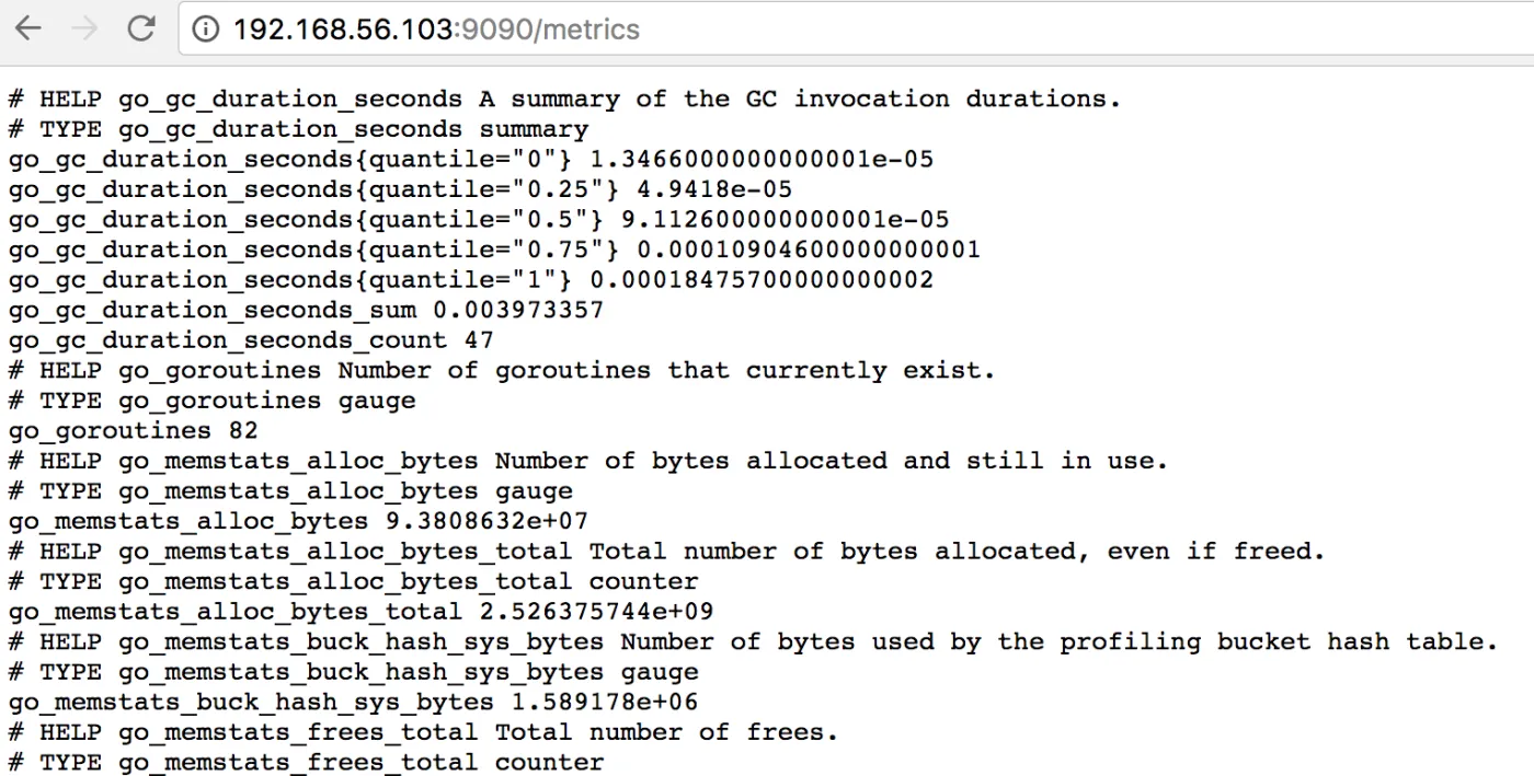 就是 Prometheus Server 自己,可见 Prometheus 本身也会收集自己的监控数据。同样地,我们也可以通过 http://192.168.56.103:9090/metrics 测试一下。