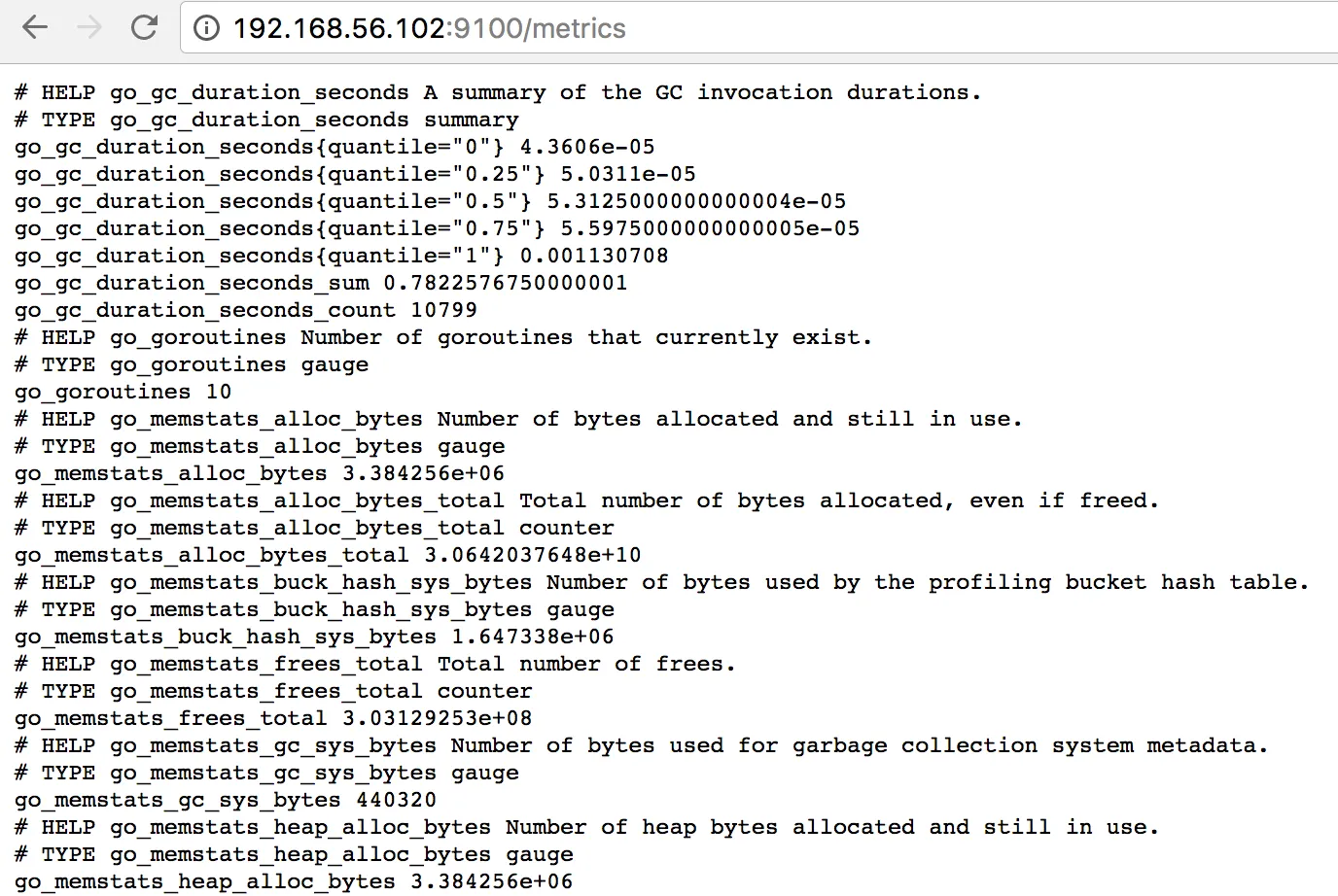 Node Exporter 启动后,将通过 9100 提供 host 的监控数据。在浏览器中通过 http://192.168.56.102:9100/metrics 测试一下。
