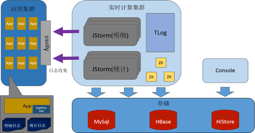 为彻底解决业务峰值对EagleEye计算集群的冲击,将部分实时计算逻辑下沉到业务方的机器中,使得业务量和所需采集的日志量解耦,保证计算集群的稳定性。具体实现是在业务方的机器上先将数据按照指定维度做聚合(一般是以时间维度),计算集群采集该统计数据后再次聚合,极大的稳定了计算集群的负载。