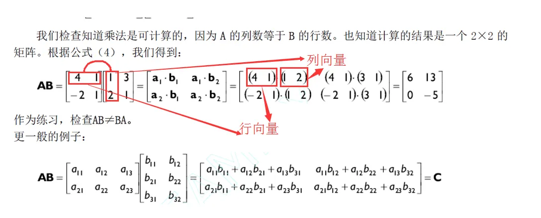 定义:A(m*n) B(n*p) 则乘积AB有意义,且等于一个矩阵C(m*p),其中乘积C[i][j] = A的第i个行向量 * B的第j个列向量的点积。