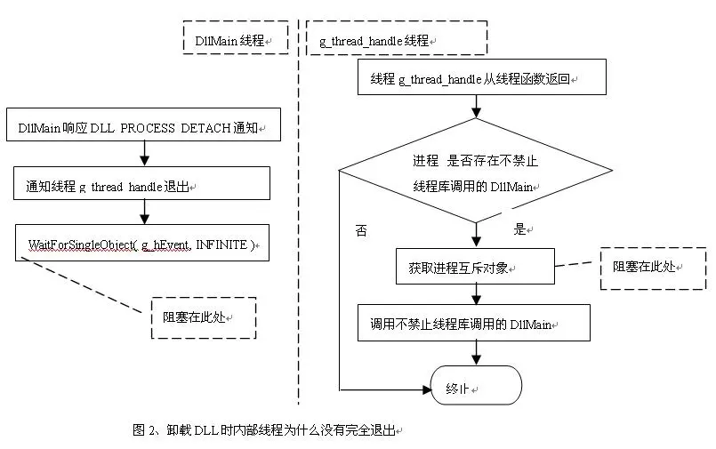 注意,从图2可以看出,如果当前进程中的所有 DLL都调用了DisableThreadLibraryCalls函数,那么上述代码中的DLL也能正常退出。曾经写过一个程序,除了加载一个这样有问题的DLL没有加载其他DLL(系统的DLL除外),程序能够正常退出。