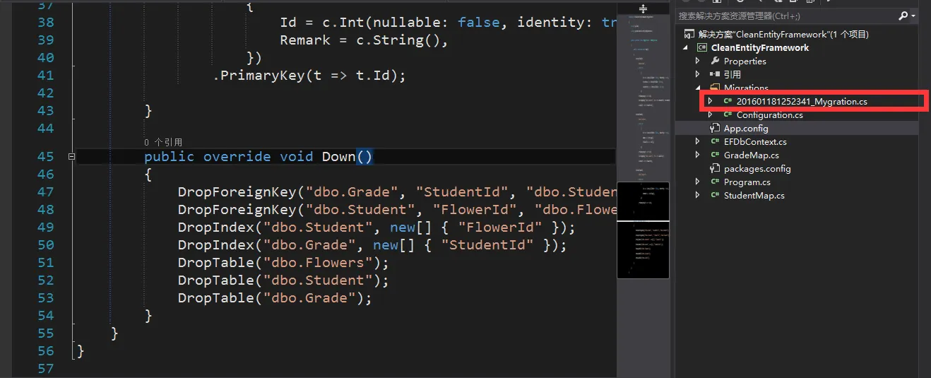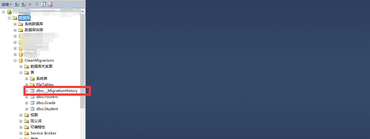 首先删除_MigrationHistory 表,通过删除迁移记录表来告诉数据迁移已经被应用,如果这个表一直存在,EF将检测最新的版本的数据迁移是否已经被应用上,与此同时如果成功了则会抛出数据库和EF架构不同步的错误,如果你删除了这个表,EF将不会去检测架构是否匹配