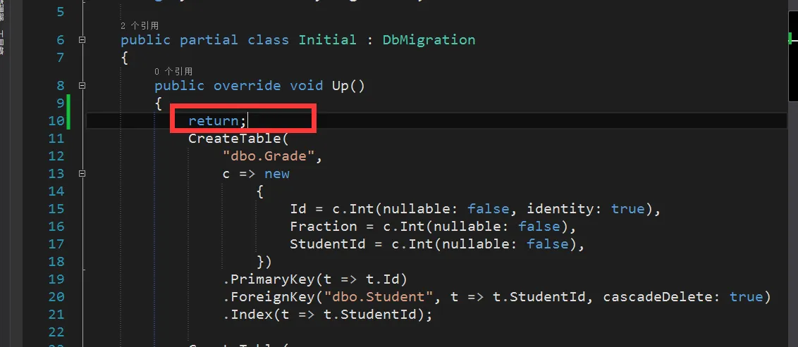 此时你通过此命令来更新到数据库则出现【数据库已存在某表的对象】,此时为了解决这一点,我们可以通过注释UP方法来伪造出迁移。在UP方法上加上【return】即可(注意:完成后删除return,此时则回到了同步状态),如下: