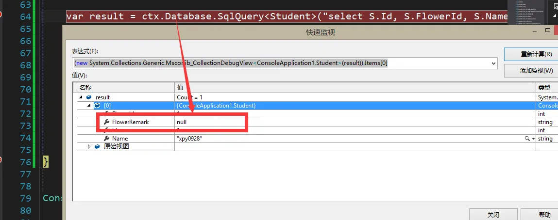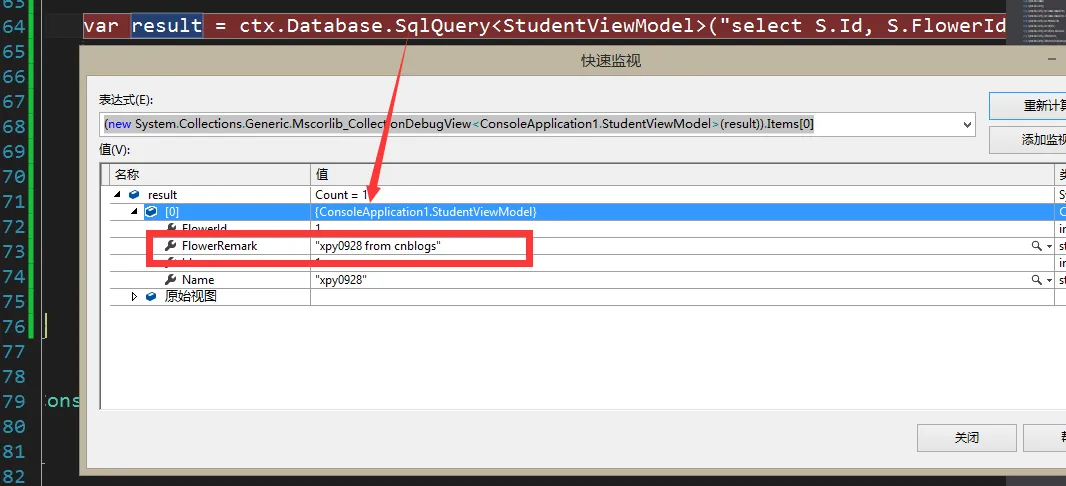 现在我们需要以Student类中FlowerId和Flower类中Id相等来获得学生类中FlowerRemark值。