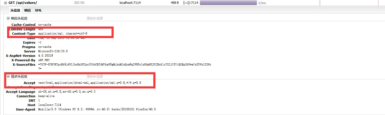 大部分浏览器中这样同样也是以XML格式打开,但是平时觉得在兼容方面非常恶心的IE 9模式下却是JSON,当然既然能以JSON打开肯定是没有包括application/xml了。
