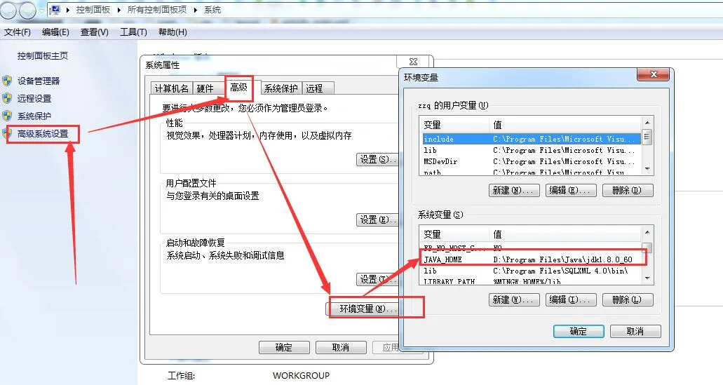 计算机--》右键,属性--》高级系统属性--》高级--》环境变量--》系统变量中添加java_home