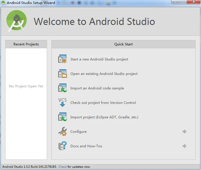 双击android-studio-bundle-141.2178183-windows.exe一步步安装即可。没什么特别的,由于我采用的是在线安装的方式。因而首次启动的时候需要下载一些Android需要的组件,因而这里面需要翻越GFW,根据自己的情况设置即可(业内流行一句话叫做不会FQ的程序猿不是好程序猿)。安装完成后首次启动时界面如下。