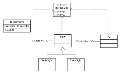 优点:ToggleSwitch依赖于抽象类Light,具有更高的稳定性,而BulbLight与TubeLight继承自Light,可以根据"开放-封闭"原则进行扩展。只要Light不发生变化,BulbLight与TubeLight的变化就不会波及ToggleSwitch。