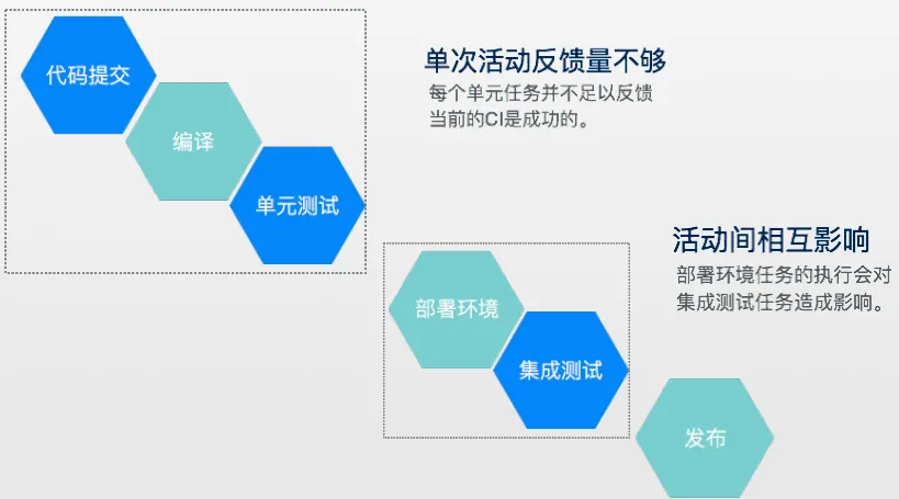 图1中会看到这样几个节点,第一个节点是代码提交、编译、单元测试。代码提交之后并不能在旁边坐着喝一杯咖啡,其实这个过程是不对的,你的反馈量是不够的,只有把编译和单元测试都放在一块的时候才可以。第二个节点是我们的部署环境和集成测试,部署环境和集成测试为什么单独分开是有问题的呢?部署和集成测试应该是在同一个活动中的,部署会影响集成测试。任何一个集成测试环境,在别人会随意点到你这个部署造成你的环境崩溃的情况下,整个测试是不安全的,我们希望活动间不相互影响,所以这两个环节应该并在一块。