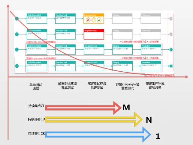 在好的交付线基础上我们提出了一套理论,我们可以看到整个持续交付的过程里面有几个点:原子级活动,覆盖面越来越大,代价越来越高,频度越来越低。最终根据这四个原则我们一直不停的去做持续交付的话会出现一个数据,就是持续集成的次数肯定会大于等于持续部署的次数,最终会大于持续交付的次数,即图3中 M大于等于N大于等于1。如果这里面的数据是趋向于相互都相等的,就是说代码提交后直接到交付了,这个过程一般是不太正常的,很难达到这个过程,中间还是会有一些集成和测试的过程。
