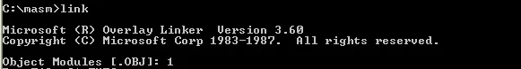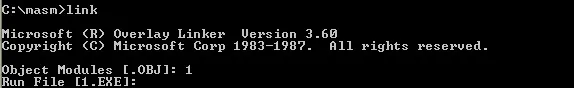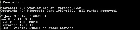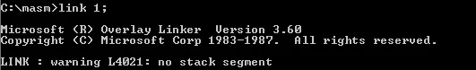 在对源程序进行编译得到目标文件后,我们需要对目标文件进行连接,从而得到可执行文件。继续上面的过程,我们再将C:\masm\1.obj连接为C:\masm\1.exe。