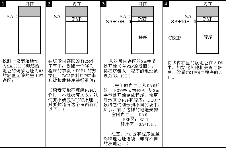 程序加载后,ds中存放着程序所在内存区的段地址,这个内存区的偏移地址为 0 ,则程序所在的内存区的地址为:ds:0;这个内存区的前256 个字节中存放的是PSP,dos用来和程序进行通信。