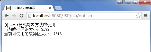 out对象是javax.servlet.jsp.JspWriter的实例,用于发送内容到响应中。JspWriter相当于一种带缓存功能的PrintWriter,设置JSP页面的page指令的buffer属性可以调整它的缓存大小。