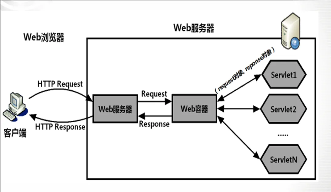 3)Web容器根据Servlet的配置文件确定调用的具体Servlet类,并把request对象、response对象传给它。