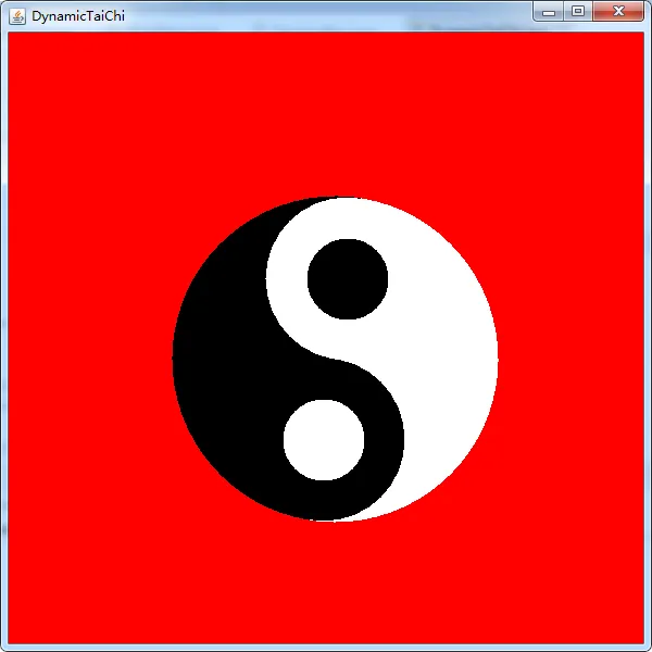 1 package demo; 2 3 import java.awt.Color; 4 import java.awt.Graphics; 5 6 import javax.swing.JFrame; 7 import javax.swing.JPanel; 8 9 /** 10 * Java 动态太极图 DynamicTaiChi (整理) 11 * 12 * 2016-1-2 深圳 南山平山村 曾剑锋 13 */ 14 15 public class DynamicTaiChi extends JPanel{ 16 private static final long serialVersionUID = 1L; 17 /* 18 * 所有的数据都是按比例依照centerX进行改变的,所以 19 * 如果想要更改面板大小的话,可以直接改centerX的值. 20 */ 21 static int centerX = 600/2; 22 static int centerY = centerX; 23 static int cicle = centerX; 24 static int angle = 0; 25 26 public DynamicTaiChi() { 27 start(); 28 } 29 private void start() { 30 new Thread(new Runnable() { 31 32 @Override 33 public void run() { 34 while (true) { 35 try { 36 angle++; 37 Thread.sleep(10); 38 repaint(); 39 } catch (Exception e) { 40 e.printStackTrace(); 41 } 42 } 43 44 } 45 }).start(); 46 } 47 @Override 48 public void paint(Graphics graphics) { 49 super.paint(graphics); 50 this.setBackground(Color.red); 51 graphics.setColor(Color.white); 52 graphics.fillArc(centerX-cicle/2, centerY-cicle/2, cicle, cicle, angle, 180); 53 graphics.setColor(Color.black); 54 graphics.fillArc(centerX-cicle/2, centerY-cicle/2, cicle, cicle, 180+angle, 180); 55 graphics.fillArc(centerX+(int)(cicle/2/2*(Math.cos(angle*Math.PI/180)))-cicle/2/2, centerY-(int)(cicle/2/2*(Math.sin(angle*Math.PI/180)))-cicle/2/2, cicle/2, cicle/2, 0, 360); 56 graphics.setColor(Color.white); 57 graphics.fillArc(centerX+(int)(cicle/2/2*(Math.cos((angle+180)*Math.PI/180)))-cicle/2/2, centerY-(int)(cicle/2/2*(Math.sin((angle+180)*Math.PI/180)))-cicle/2/2, cicle/2, cicle/2, 0, 360); 58 graphics.setColor(Color.black); 59 graphics.fillArc(centerX+(int)(cicle/2/2*(Math.cos((angle+180)*Math.PI/180)))-cicle/2/2/2, centerY-(int)(cicle/2/2*(Math.sin((angle+180)*Math.PI/180)))-cicle/2/2/2, cicle/2/2, cicle/2/2, 0, 360); 60 graphics.setColor(Color.white); 61 graphics.fillArc(centerX+(int)(cicle/2/2*(Math.cos(angle*Math.PI/180)))-cicle/2/2/2, centerY-(int)(cicle/2/2*(Math.sin(angle*Math.PI/180)))-cicle/2/2/2, cicle/2/2, cicle/2/2, 0, 360); 62 } 63 64 public static void main(String[] args) { 65 JFrame jFrame = new JFrame(); 66 jFrame.setTitle("DynamicTaiChi"); 67 jFrame.setSize(centerX*2, centerY*2); 68 jFrame.setDefaultCloseOperation(JFrame.EXIT_ON_CLOSE); 69 jFrame.setLocationRelativeTo(null); 70 71 DynamicTaiChi jPanel = new DynamicTaiChi(); 72 jFrame.add(jPanel); 73 74 jFrame.setVisible(true); 75 } 76 }