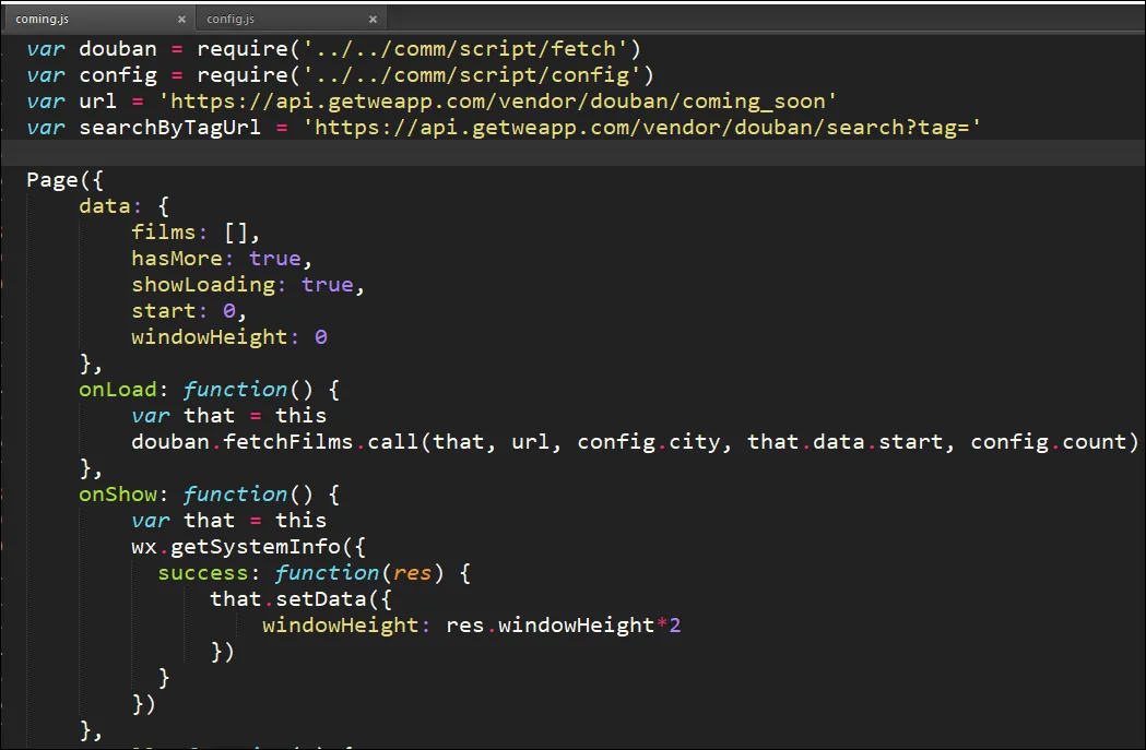 onLoad: function() { var that = this douban.fetchComming(that, that.data.start) },