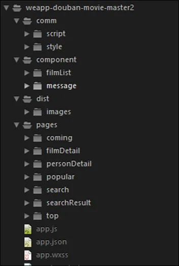 本篇随笔的改造方案是基于小程序项目 weapp-douban-movie 的,因此对比的代码也是和这个进行比较,不知道这个版本是不是原作者的旧版本,不过这个版本对文件目录的区分已经显得非常干净利落了,对电影信息的展示也统一到了模板里面,进行多次的重复利用,整体的布局和代码都做的比较好,看得出是花了不少功夫进行整理优化的了。