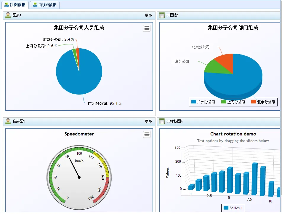 Highcharts支持曲线图、饼图、柱状图、仪表图、散点图等等几十种图形,界面展示效果非常丰富,3D效果也很好看。列出几个供参考下吧