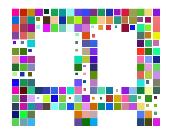 <!DOCTYPE html> <html> <head> <title>含羞默默一张一合效果---田</title> <meta http-equiv="Content-Type" content="text/html; charset=UTF-8"> <script type="text/javascript" src="http://files.cnblogs.com/kuikui/jquery.js"></script> <style type="text/css"> *{margin:0px;padding:0px;} #test{width:800px; height: 800px; margin: 30px auto 0px; overflow: hidden; position: relative; background-color: #F1F1F1;} #test span{display: block; position: absolute; width: 30px; height: 30px; } </style> </head> <body> <div id="test"></div> <script type="text/javascript"> var getRandomColor = function(){ return '#' + (function(color){ return (color += '0123456789abcdef'[Math.floor(Math.random()*16)]) && (color.length == 6) ? color : arguments.callee(color); })(''); } function creSpan(n,mpId,mleft,mtop){ var mSpan = document.createElement("span"); var pId = mpId[0]; pId.appendChild(mSpan); with(mSpan.style){ left = mleft+"px"; top = mtop+"px"; background = getRandomColor(); } } </script> <script type="text/javascript"> $(function(){ var myleft = 100; var mytop = 50; var arr = new Array(); var test = $("#test"); for(var j=0;j<23;j++){ arr[j] = new Array(); if(j<3){ for(var i=0;i<19;i++){ myleft+=32; arr[j][i] = new creSpan((j+1)*(i+1),test,myleft,mytop); } } else if(j>2&&j<10){ for(var i=0;i<19;i++){ myleft+=32; if(i<3){ arr[j][i] = new creSpan((j+1)*(i+1),test,myleft,mytop); } else if(i>7&&i<11){ arr[j][i] = new creSpan((j+1)*(i+1),test,myleft,mytop); } else if(i>15){ arr[j][i] = new creSpan((j+1)*(i+1),test,myleft,mytop); } } } else if(j>9&&j<13){ for(var i=0;i<19;i++){ myleft+=32; arr[j][i] = new creSpan((j+1)*(i+1),test,myleft,mytop); } } else if(j>12&&j<20){ for(var i=0;i<19;i++){ myleft+=32; if(i<3){ arr[j][i] = new creSpan((j+1)*(i+1),test,myleft,mytop); } else if(i>7&&i<11){ arr[j][i] = new creSpan((j+1)*(i+1),test,myleft,mytop); } else if(i>15){ arr[j][i] = new creSpan((j+1)*(i+1),test,myleft,mytop); } } } else{ for(var i=0;i<19;i++){ myleft+=32; arr[j][i] = new creSpan((j+1)*(i+1),test,myleft,mytop); } } mytop+=32; myleft=100; } $.each($("#test span"),function(k,v){ $(this).mouseover(function(){ $(this).animate({ width:"10px", height:"10px", left:"+="+parseInt(30-20)/2+"px", top:"+="+parseInt(30-20)/2+"px" },3000,function(){ $(this).animate({ width:"30px", height:"30px", left:"-="+parseInt(30-20)/2+"px", top:"-="+parseInt(30-20)/2+"px" },1000); }); }); }); }); </script> </body> </html>