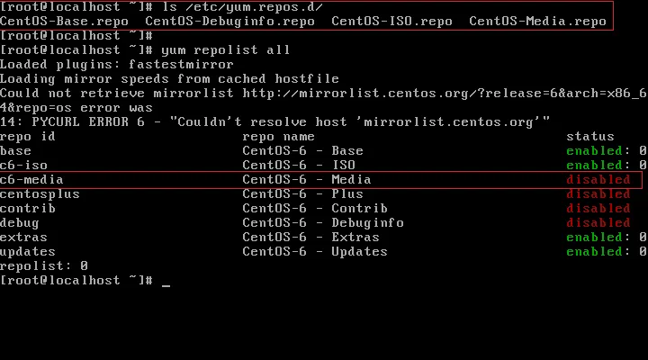 2. CentOS所有的软件源都定义在/etc/yum.repos.d目录。默认安装已经定义了一个c6-media的软件源,处于禁用状态。